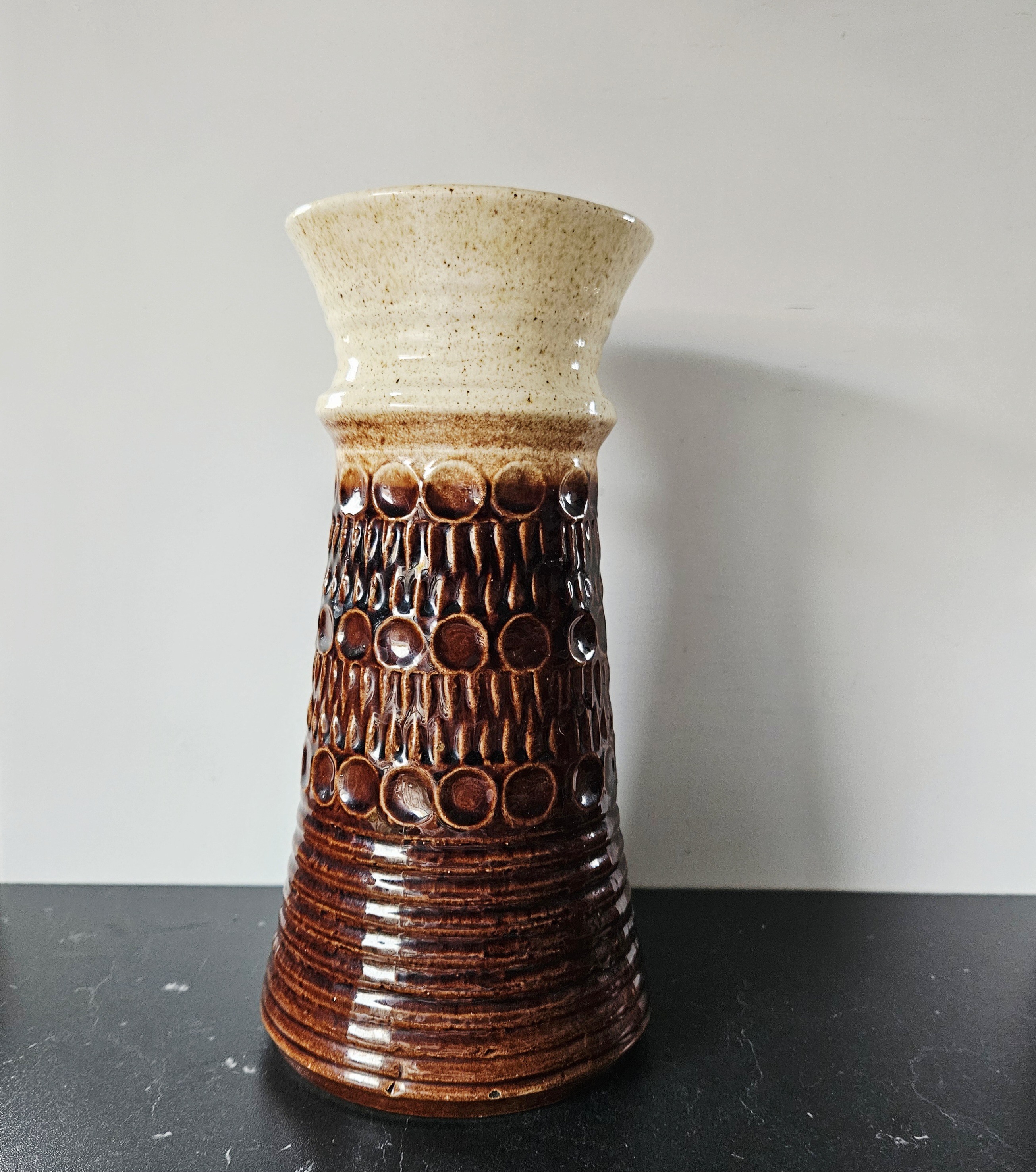 Mooi taps toelopende vaas in 2 kleurige Fat Lava en gaaf reliëf.