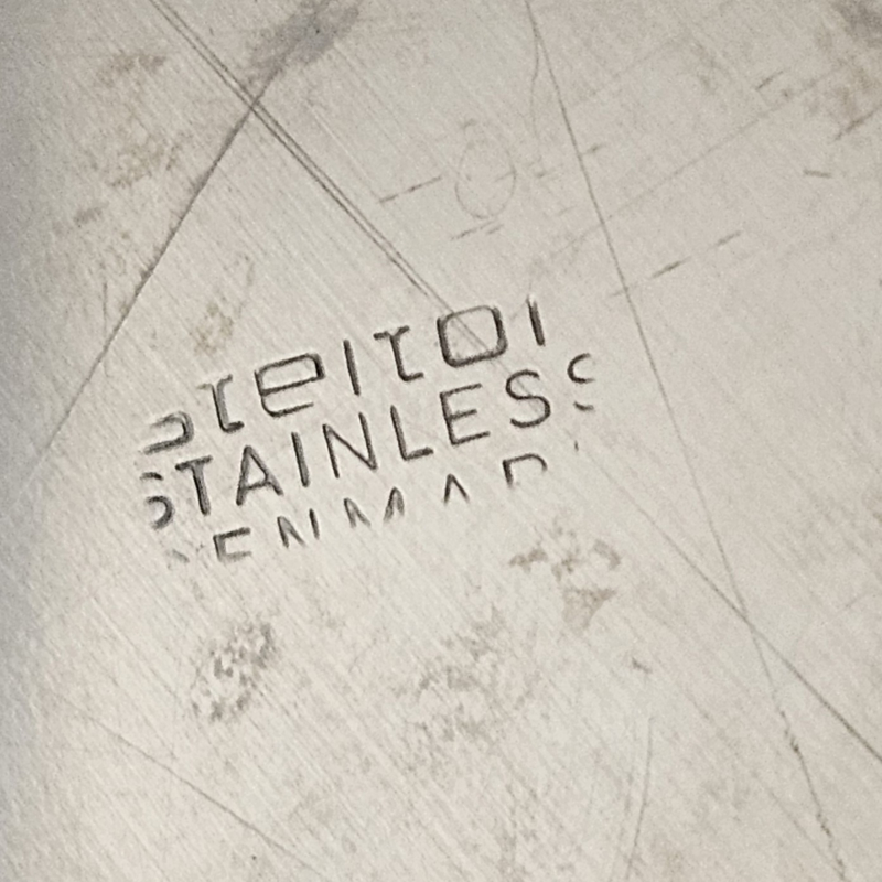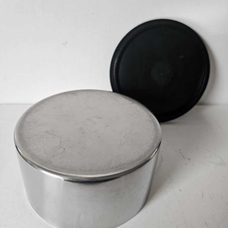 Gave vintage suikerpot van Stelton. Ontworpen in 1977 door Erik Magnussen. De RVS suikerpot heeft een kleine uitsparing voor een lepel en heeft een zwarte kunststof deksel.