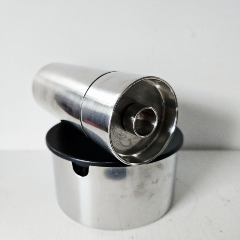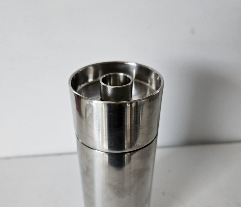 Prachtige peper/ zoutmolen van hoogwaardig RVS. Ontworpen door Arne Jacobsen, serie Cylinda voor het Deense Stelton. De molen heeft een mechanisme dat kan worden aangepast aan grove of fijne maling.