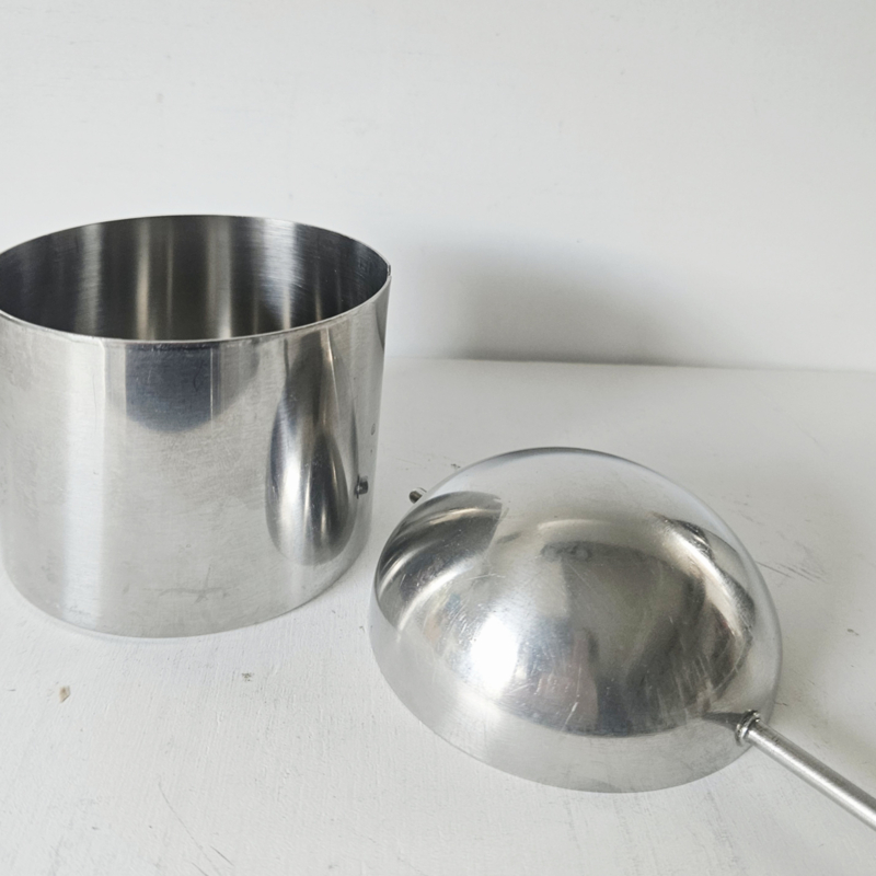 Design asbak uit de jaren 60. Ontworpen door de Deense Arne Jacobsen (1902-1971) voor Stelton, uit de Cylinda Line serie. Praktisch door de kantelbare deksel waardoor het afgeschermd wordt voor de geur. Aan de deksel is niet te zien dat ie gebruikt is,