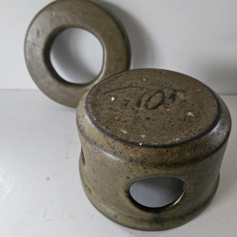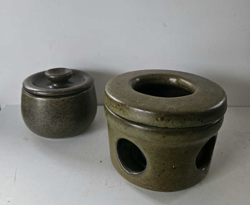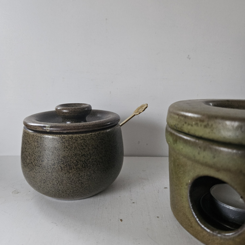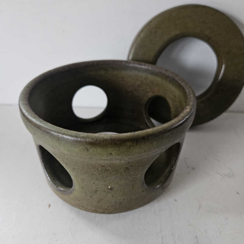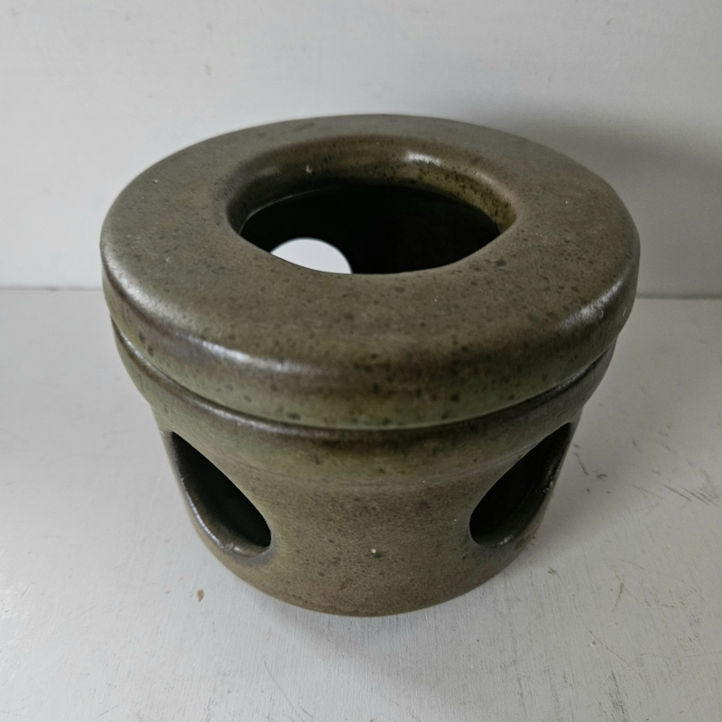 Een stoer theelicht/ rechaud in gemeleerd donkergroen aardewerk. Ontworpen door Lucie Q Bakker en geproduceerd door Koninklijk Tichelaar in de jaren 50. De rechaud is onderdeel van de Quirina serie.