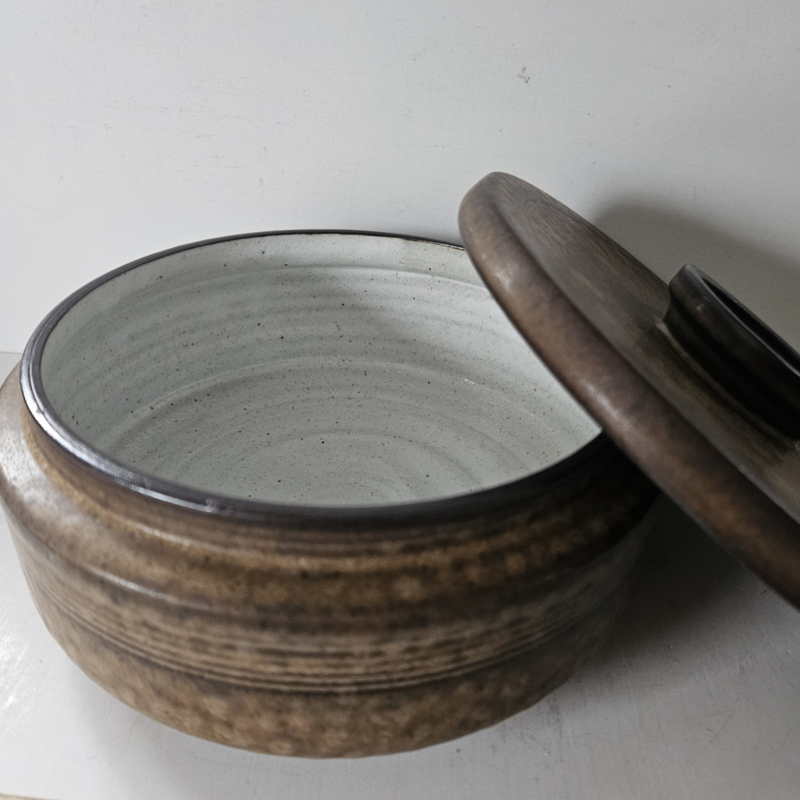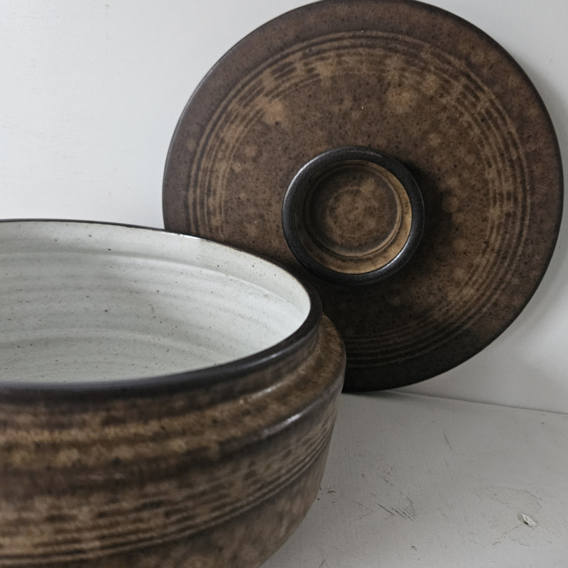 Prachtige schaal met deksel van potterie Zaalberg, jaren 60-70. In een bruin gemeleerde afwerklaag. Onderdeel van de serie Ringeling.