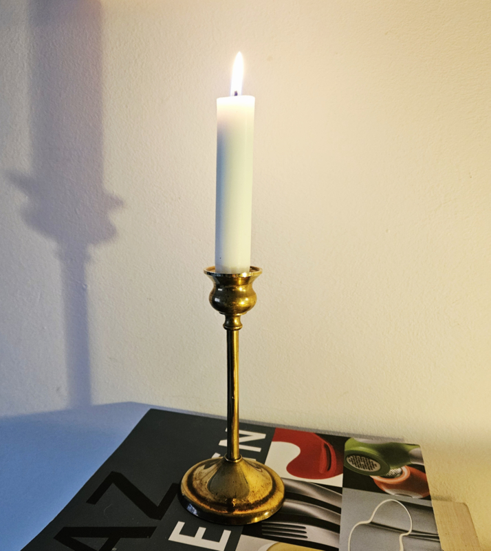 Kleine messing kandelaar waar een gewone dinerkaars inpast.