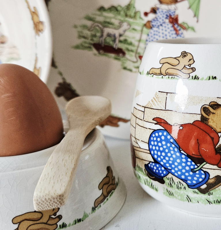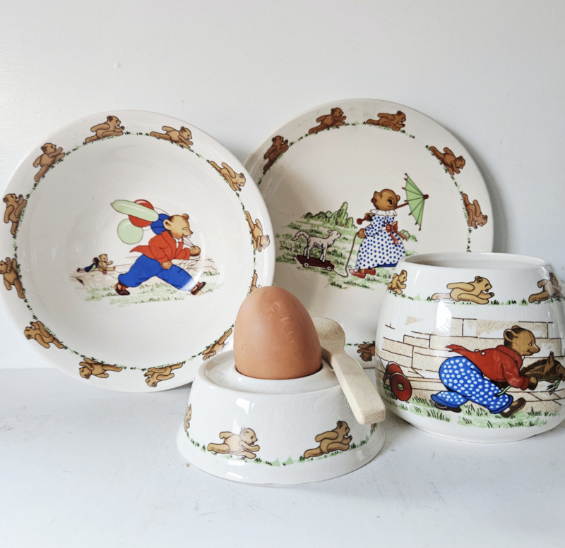 Een prachtig Engels kinder eetservies set dat uit een beker, bordje, eierdop en schaaltje bestaat. Met leuke tekening van het beertje.