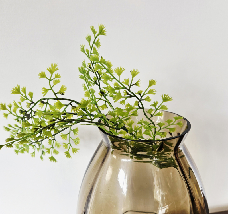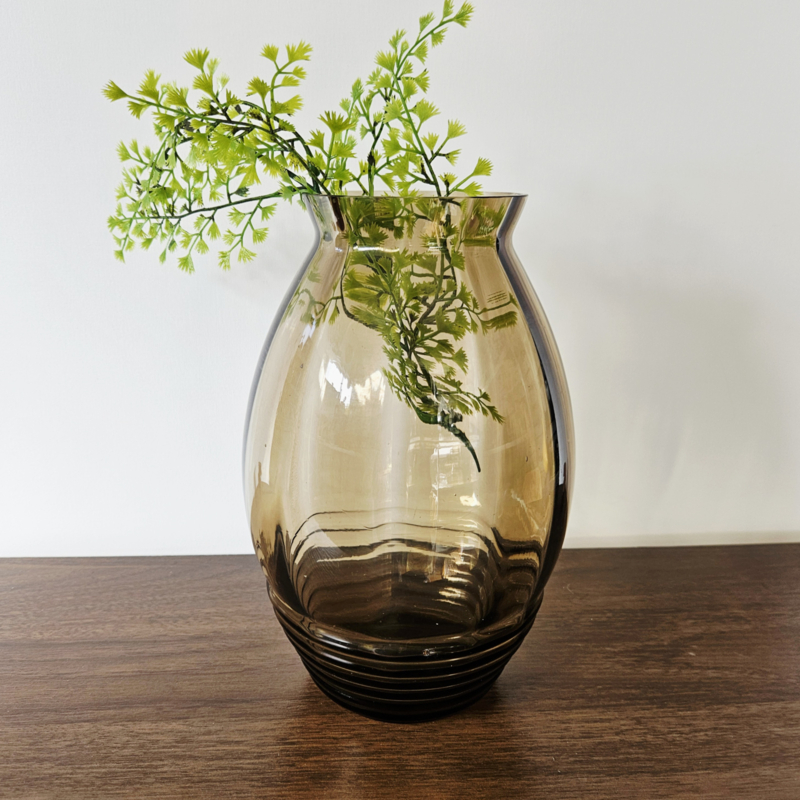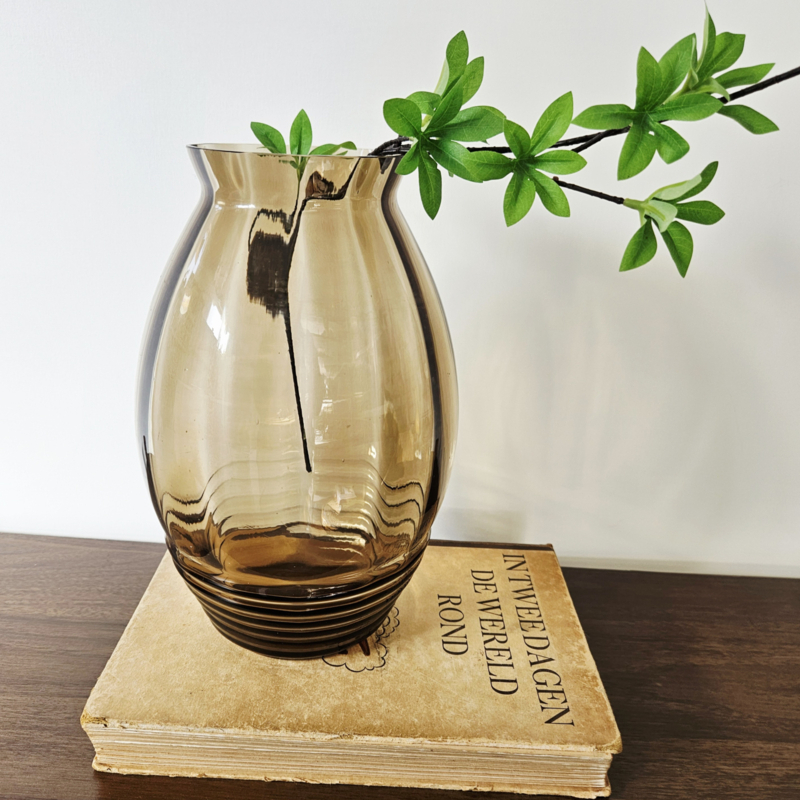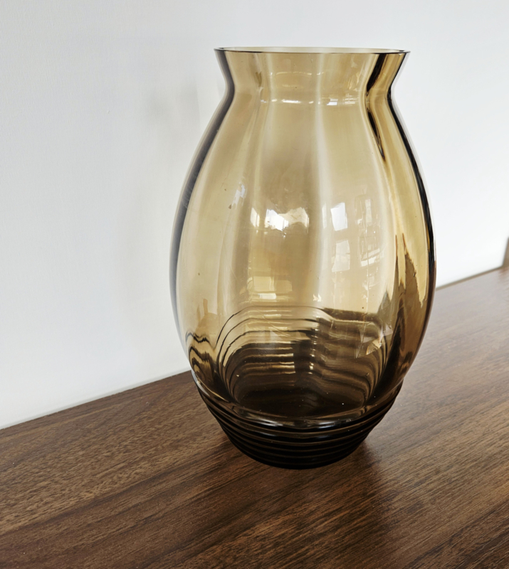 Prachtige glazen facetten vaas van fumee kleurig glas. Ontworpen door Copier in de jaren 50. De vaas heeft horizontale en verticale (iets minder opvallend dan de horizontale) ribbels (facetten genaamd) in het glas.