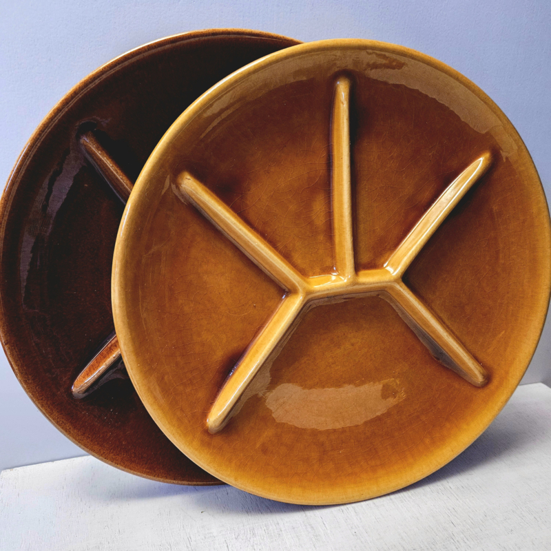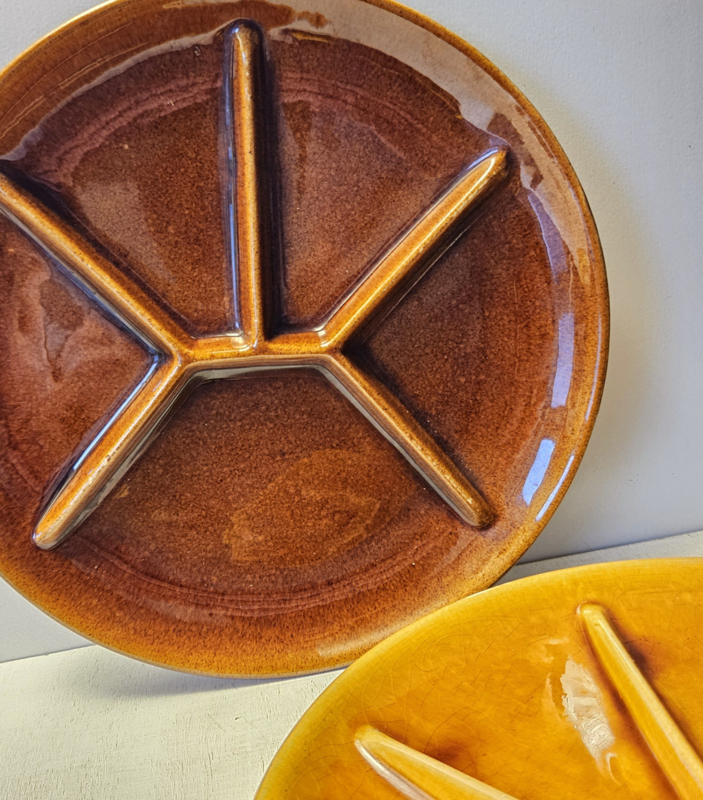 Een set van 2 fondueborden in de kleuren bruin en oker/amber.